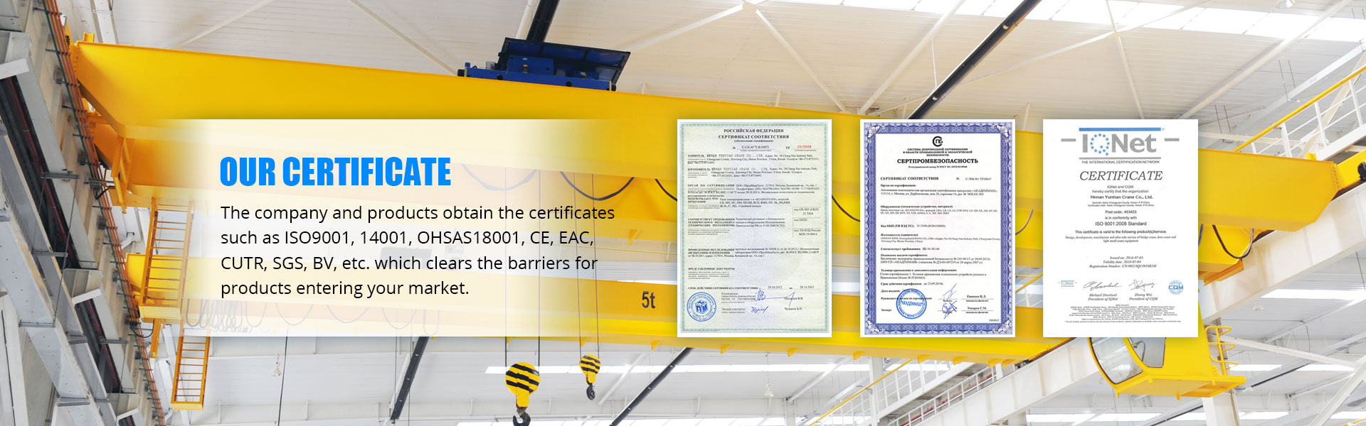 Wir können Ihnen alle Arten Industriekräne von 0.25tons zu 900tons liefern, Durchlauf GB / T 19001-2000 idt ISO 9001: 2000, GB / T 24001-2004 idt ISO 14001: 2004, GB / T 28001-2001, OHSAS 18001: 1999, CE, GOST, SGS, TÜV, BV und so weiter.
